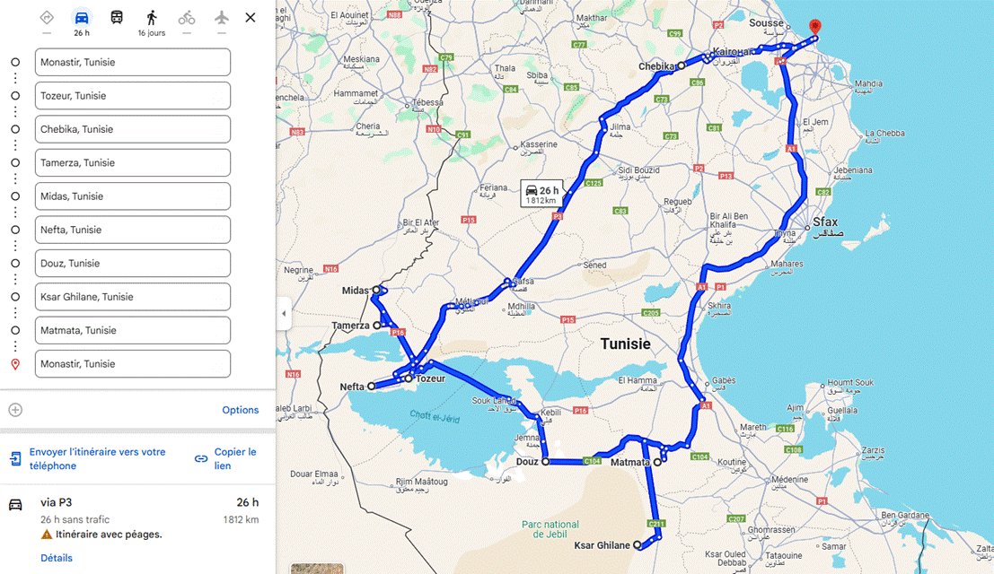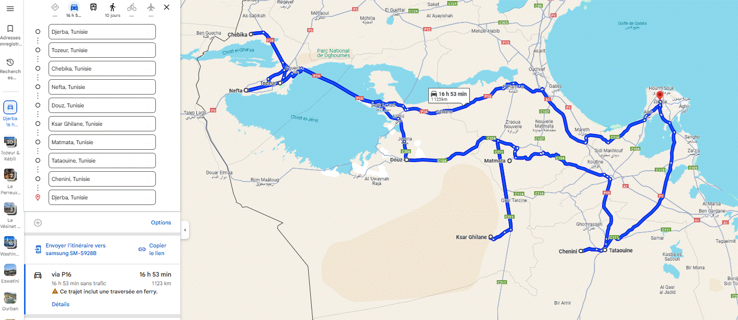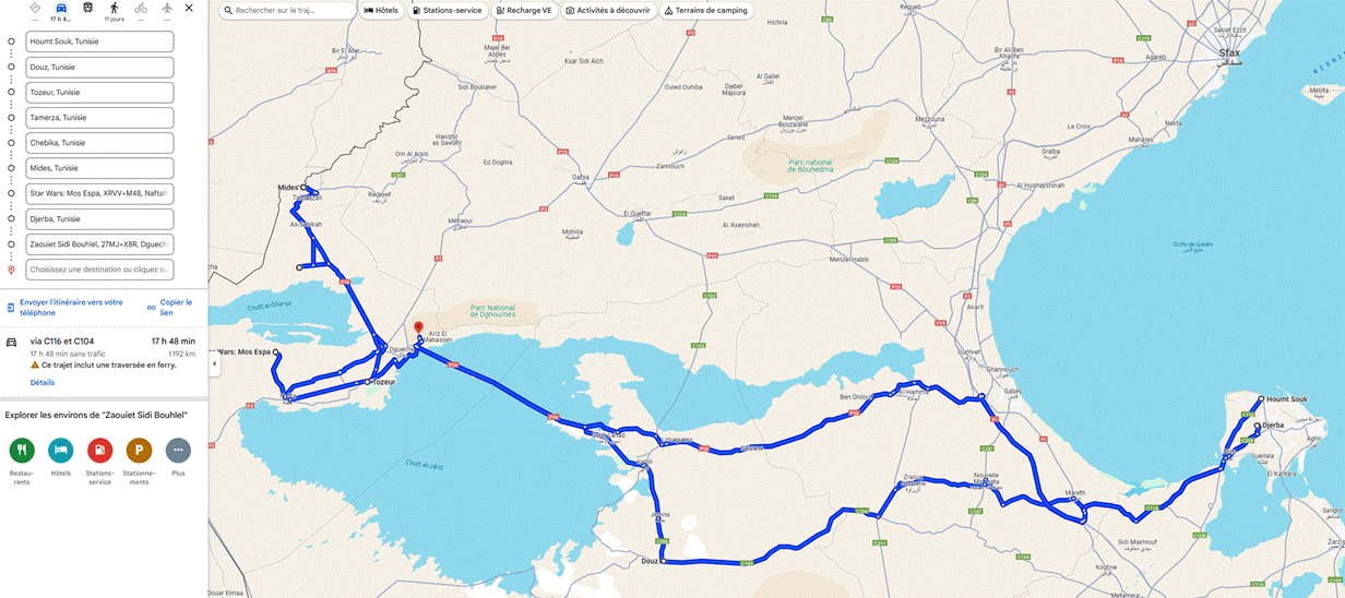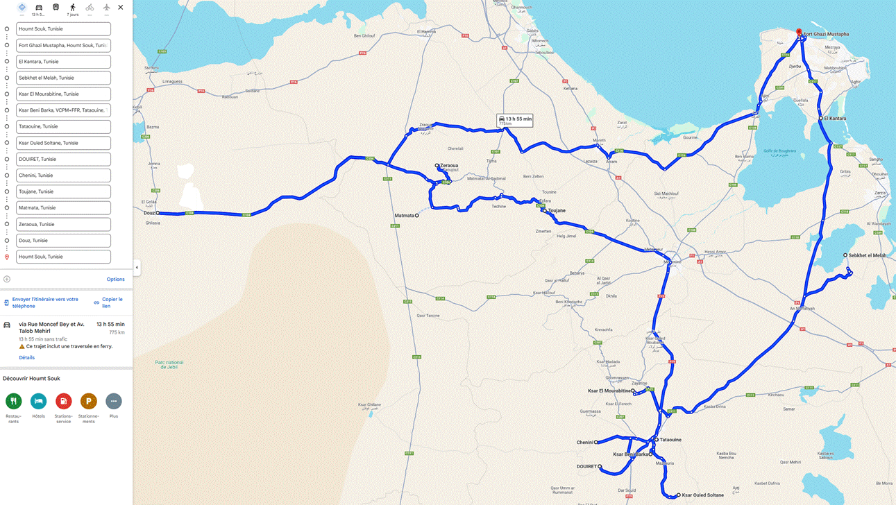 https://www.google.com/maps/dir/Houmt+Souk,+Tunisie/Fort+Ghazi+Mustapha,+Houmt+Souk,+Tunisie/El+Kantara,+Tunisie/Sebkhet+el+Melah,+Tunisie/Ksar+El+Mourabitine,+Tunisie/Ksar+Beni+Barka/Tataouine,+Tunisie/Ksar+Ouled+Soltane,+Tunisie/DOUIRET,+Tunisie/Chenini,+Tunisie/Toujane,+Tunisie/Matmata,+Tunisie/Zeraoua,+Tunisie/Douz,+Tunisie/Houmt+Souk,+Tunisie/