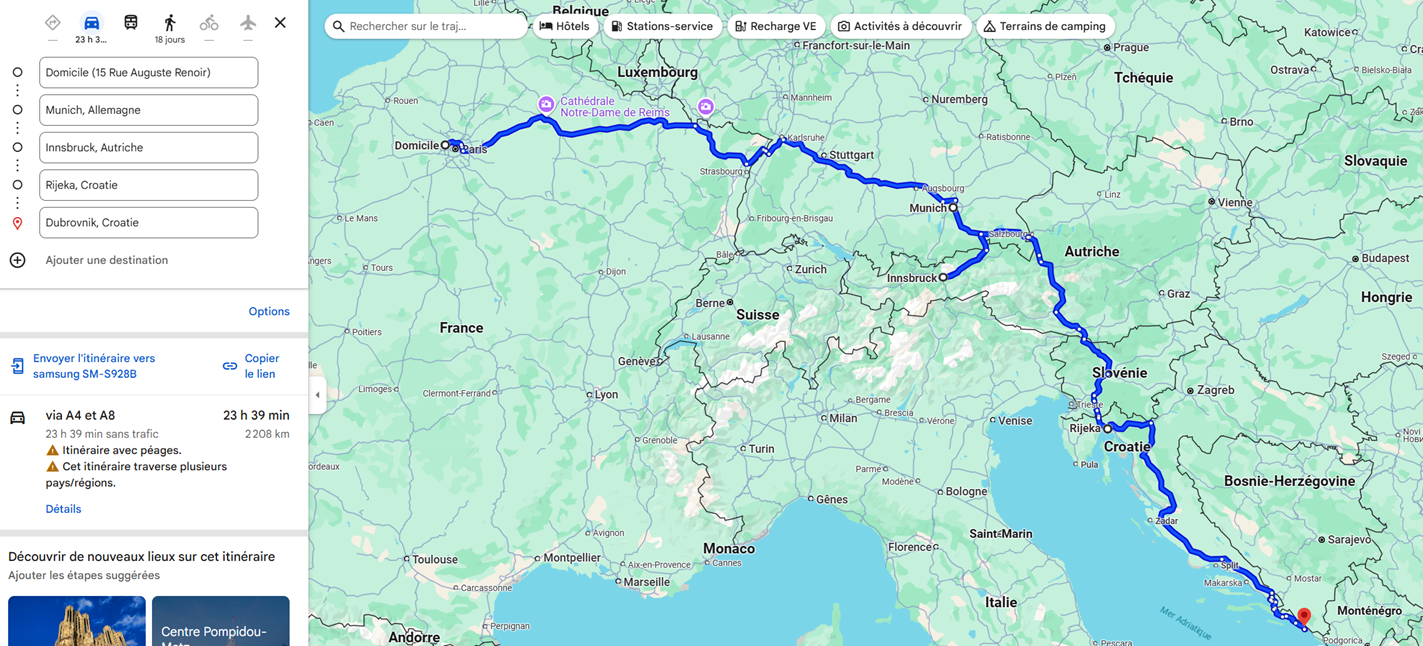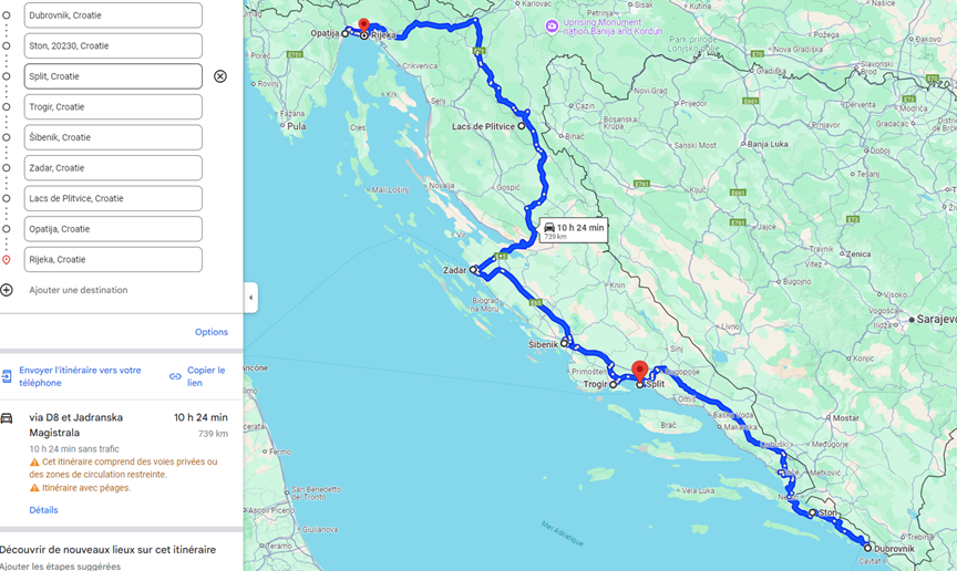 D fini moi un trajet en voiture en Croatie de Dubrovnik a Rijeka. Affiche-moi les villes sur le trajet qui m rite de visiter. Le trajet doit durer 15 jours. Donne-moi le r sultat dans un tableau avec les colonnes suivantes : nom de la ville, distance en kilom tres depuis la ville pr c dente, principales attractions de la ville, et nombre de jours n cessaire a sa visite.