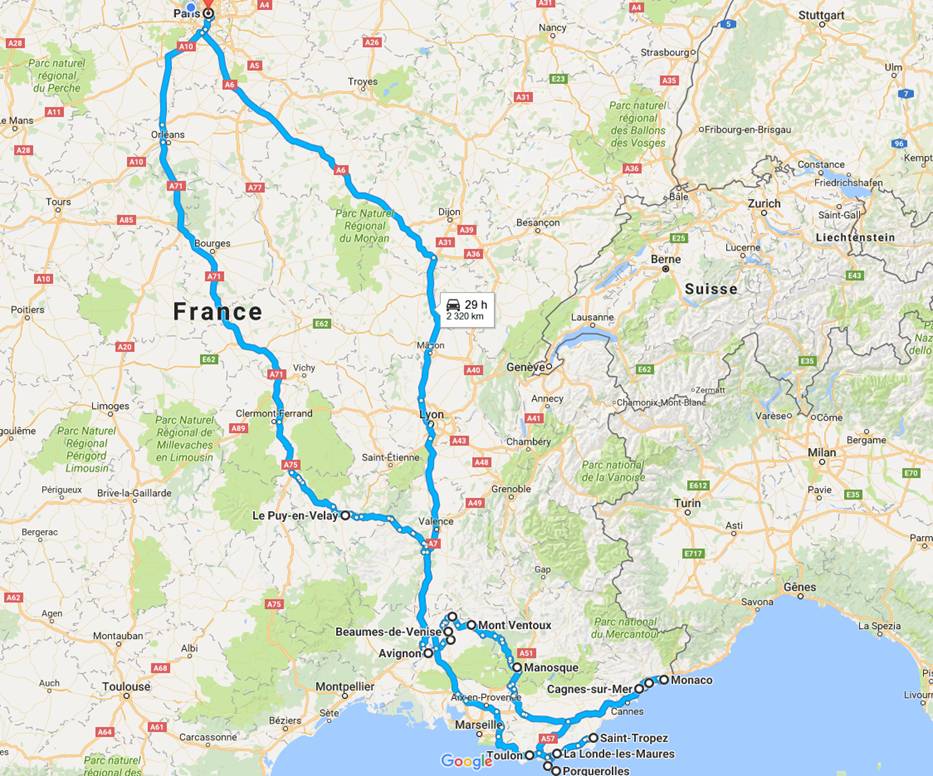 https://www.google.com/maps/dir/Paris,+France/Avignon,+France/Carpentras,+France/Carpentras,+France/Beaumes-de-Venise,+France/Vaison-la-Romaine,+France/Mont+Ventoux/Manosque,+France/Cagnes-sur-Mer,+France/Monaco/Nice,+France/La+Londe-les-Maures,+France/Saint-Tropez,+France/Porquerolles/Presqu'%C3%AEle+de+Giens/Toulon,+France/Le+Puy-en-Velay,+France/Paris,+France/@45.9899607,3.3522823,7.25z/data=!4m110!4m109!1m5!1m1!1s0x47e66e1f06e2b70f:0x40b82c3688c9460!2m2!1d2.3522219!2d48.856614!1m5!1m1!1s0x12b5eb8739bc9d07:0xe6429b6efa1d7b36!2m2!1d4.805528!2d43.949317!1m5!1m1!1s0x12b589fe4a25d91d:0x40819a5fd8fc530!2m2!1d5.048722!2d44.0555639!1m5!1m1!1s0x12b589fe4a25d91d:0x40819a5fd8fc530!2m2!1d5.048722!2d44.0555639!1m5!1m1!1s0x12b5886616d8258d:0x40819a5fd8fc660!2m2!1d5.029084!2d44.122161!1m5!1m1!1s0x12b5809d47a513ad:0x40819a5fd8fbe90!2m2!1d5.075198!2d44.240968!1m5!1m1!1s0x12ca645aaf6f7367:0xd3f24ac5c0a1bcd!2m2!1d5.2786781!2d44.174087!1m5!1m1!1s0x12cbcdb3ba6c6b09:0x1bd50854176f8011!2m2!1d5.790916!2d43.835744!1m5!1m1!1s0x12cdd3a2d11dc9c9:0x5c4349fc32c96606!2m2!1d7.14882!2d43.663739!1m5!1m1!1s0x12cdc26f7b3f8531:0x74f7784c3ac49cfc!2m2!1d7.4246158!2d43.7384176!1m5!1m1!1s0x12cdd0106a852d31:0x40819a5fd979a70!2m2!1d7.2619532!2d43.7101728!1m5!1m1!1s0x12c9255fdd848e45:0x772fca117f7e16d9!2m2!1d6.235208!2d43.138622!1m5!1m1!1s0x12cec7148316e747:0x912a1b632d84b9df!2m2!1d6.6407109!2d43.2676808!1m5!1m1!1s0x12c8d8778263c633:0x248bb6bca7678a6e!2m2!1d6.2216678!2d43.0010171!1m5!1m1!1s0x12c920c49eeaab9f:0x6945042eb350bd76!2m2!1d6.137041!2d43.038034!1m5!1m1!1s0x12c91b027b35b2fd:0x40819a5fd8fc830!2m2!1d5.928!2d43.124228!1m5!1m1!1s0x47f5fa4041a0c829:0x4093cafcbe7fa70!2m2!1d3.882936!2d45.042768!1m5!1m1!1s0x47e66e1f06e2b70f:0x40b82c3688c9460!2m2!1d2.3522219!2d48.856614!3e0